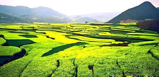 地理:在羅平觀花,最佳地點一般推薦的是羅平縣城東北方向的金雞。登到金雞峰上看花海,這里的田較平坦,稍遠處有些孤峰拔起,感覺壯闊。也可由縣城沿大水井去多伊河風景村的途中賞花,這里地形起伏較大,花田隨地形種植,富于變化,也是拍片的好地方。還有城北的牛街鄉(xiāng),這里有梯田,梯田上有的種油菜,有的種小麥、蔬菜等,各種色塊交織,與金雞的花海不同,是另一種韻味。
