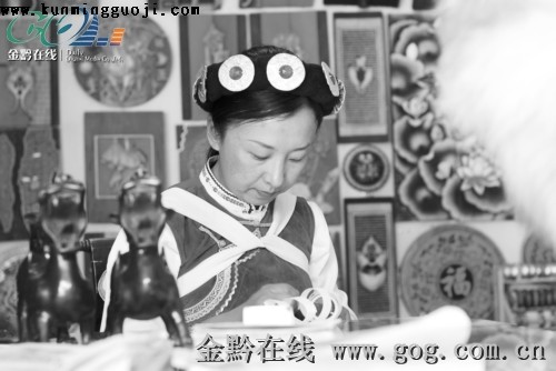 昆明民族園東巴村里東巴姑娘正在制作民族文化用品。