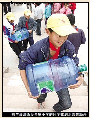 新報(bào)愛(ài)心抗旱聯(lián)盟成立以來(lái),多家單位和組織踴躍參加到送水的隊(duì)伍中來(lái),4月2日,昆明中國(guó)國(guó)際旅行社組織員工捐贈(zèng)了2700桶礦泉水,直接送去了位于世界恐龍谷附近的楚雄恐龍山鎮(zhèn),據(jù)昆明中國(guó)國(guó)際旅行社負(fù)責(zé)人介紹,昆明國(guó)旅作為全國(guó)百?gòu)?qiáng)國(guó)際旅行社云南資歷最老的龍頭旅行社,在旱情發(fā)生后就先后三次組織員工捐款抗旱,本次已經(jīng)是第四次了,這次為了能解災(zāi)民喝水的燃眉之急,特別組織了一輛送水的卡車,裝載著2700桶飲用礦泉水送到了楚雄恐龍山鎮(zhèn)�!拔覀兇螂娫捊o楚雄州政府詢問(wèn)楚雄旱情比較嚴(yán)重的地方在哪里,他們告訴我們祿豐縣城比較缺水,特別是恐龍山附近的幾個(gè)村子,于是我們就把送水的首站選在了這里,下周我們還將繼續(xù)送這樣的兩車水到石林去�!�昆明國(guó)旅總經(jīng)理辦公室主任何曙剛對(duì)記者說(shuō)。