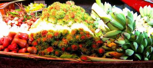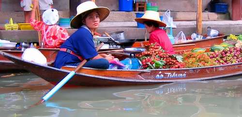 泰國的樂器等等,令人眼花繚亂。而如果你看中哪家小店的東西,只需做一個(gè)手勢(shì),船家自然會(huì)把小船靠到這家店鋪的門前,讓你買個(gè)痛快。當(dāng)然,千萬別忘了砍價(jià)喲,小販們要價(jià)的水分至少在2/3以上,不過還好,他們會(huì)很快“屈服”在精明游客的還價(jià)當(dāng)中。