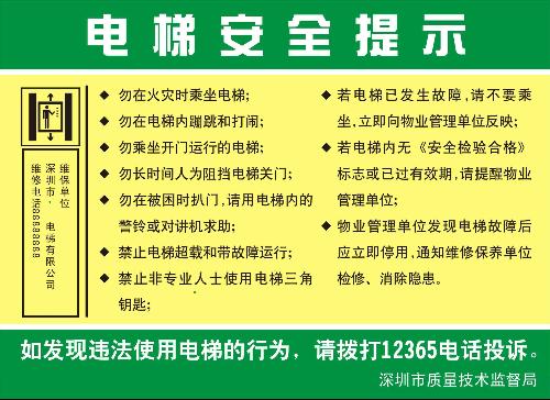 1、乘坐電梯,首先要注意查看電梯內(nèi)有沒(méi)有質(zhì)量技術(shù)監(jiān)督部門核發(fā)的《安全檢驗(yàn)合格》標(biāo)志,并注意標(biāo)志是否在有效期內(nèi)。乘坐有《安全檢驗(yàn)合格》標(biāo)志的電梯,是保障安全的前提。