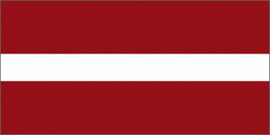 國(guó)旗:呈橫長(zhǎng)方形,長(zhǎng)與寬之比約為2∶1。自上而下由紅、白、紅三個(gè)平行的橫寬條組成。早在13世紀(jì)時(shí),居住在拉脫維亞的拉特加人就使用過(guò)紅、白、紅圖案的旗幟。1918年這面民族旗幟得到了事實(shí)上的合法化,1922年確定國(guó)旗的顏色和比例。1940年拉脫維亞成為原蘇聯(lián)的加盟共和國(guó),當(dāng)時(shí)的國(guó)旗為在原蘇聯(lián)國(guó)旗旗面的下部加白、藍(lán)色的水波紋圖案。1990年拉脫維亞宣布獨(dú)立,象征拉脫維亞民族統(tǒng)一的紅、白、紅旗又被用來(lái)作為國(guó)旗。